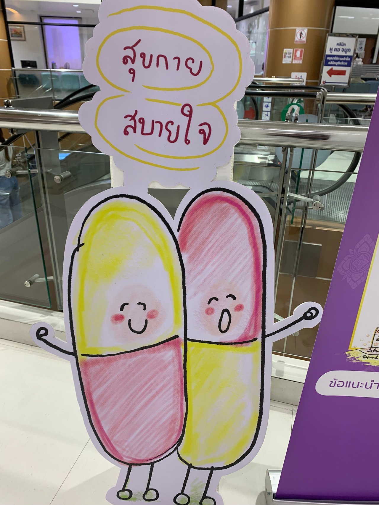 The first things that attracted my eyes are the cartoons of doctor, nurse, tablets, kids, and monk, which made me feel peaceful.