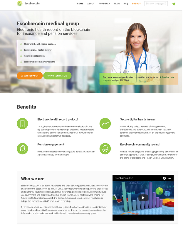 전체 피어 - 투 - 피어 (peer to health) 생태계를 창조합니다. Escobarcoin은 모든 병원, 진료소, HMO, 연금, 보험업이 거래를하고 의료 보상 및 지역 사회 성장과 같은 정보 및 협회 서비스를 전달하는 방식을 혁신하기위한 것입니다.