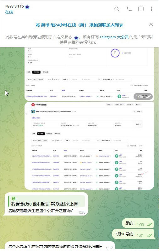 上周因操作失误在交换TRX机器人时误转了80000U,联系管理员后拒不认错,还擅自删除了对话记录,今日竟利用我转错的资金开通了新群组。