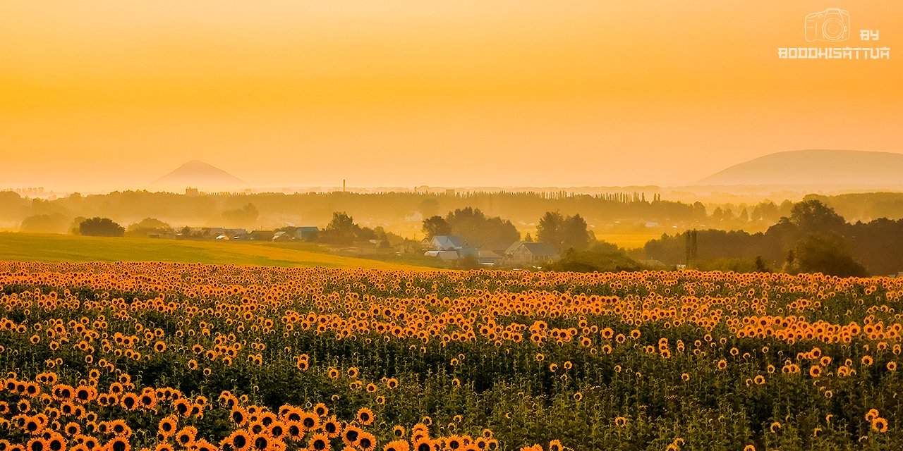 Last summer I was traveling through Russia by car. One morning it was foggy but the sun were shining great. There were two not so big mountains hiding in the fog at the right of the road. I had no free time but this picture was so interesting that when I saw a sunflowers field at the right of me I decided to stop and make few shots. I'm not sure that my picture can describe how beautiful was this landscape but I hope that I was able to at least a little to convey this.