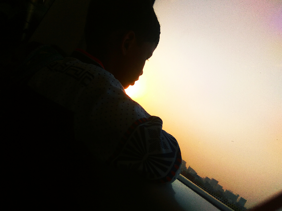 He turned his head toward the window Side and sitting on his knees to see outside the window.