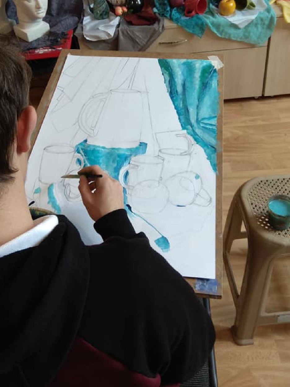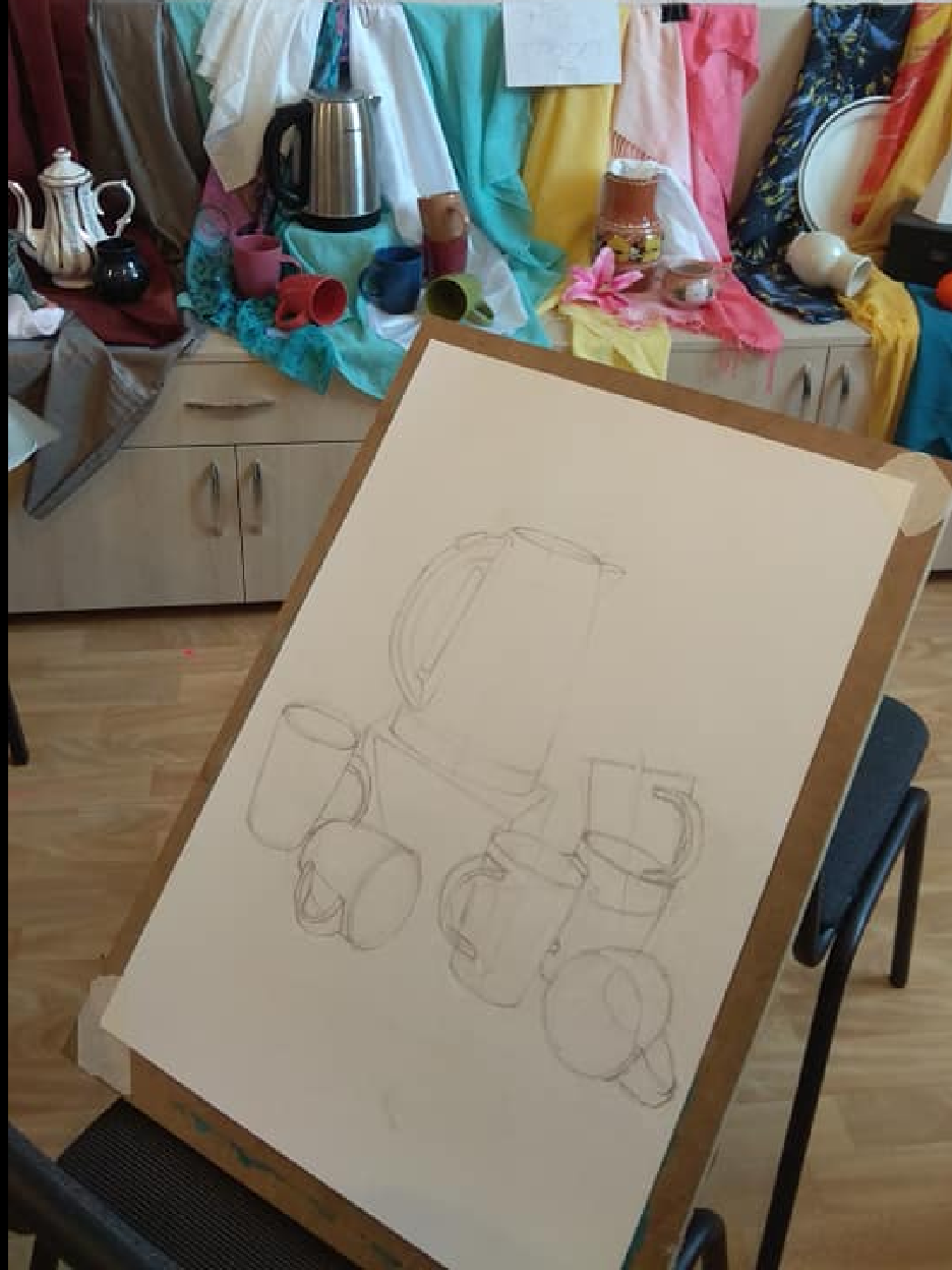 1.Denis made a sketch of the still life. He had to consider all the rules of perspective. Objects that are closer, we draw larger than those in the background.