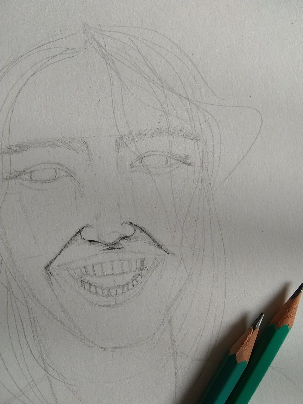 Tracé unas primeras líneas para ubicar los elementos y proporciones del rostro: nariz, boca, ojos..