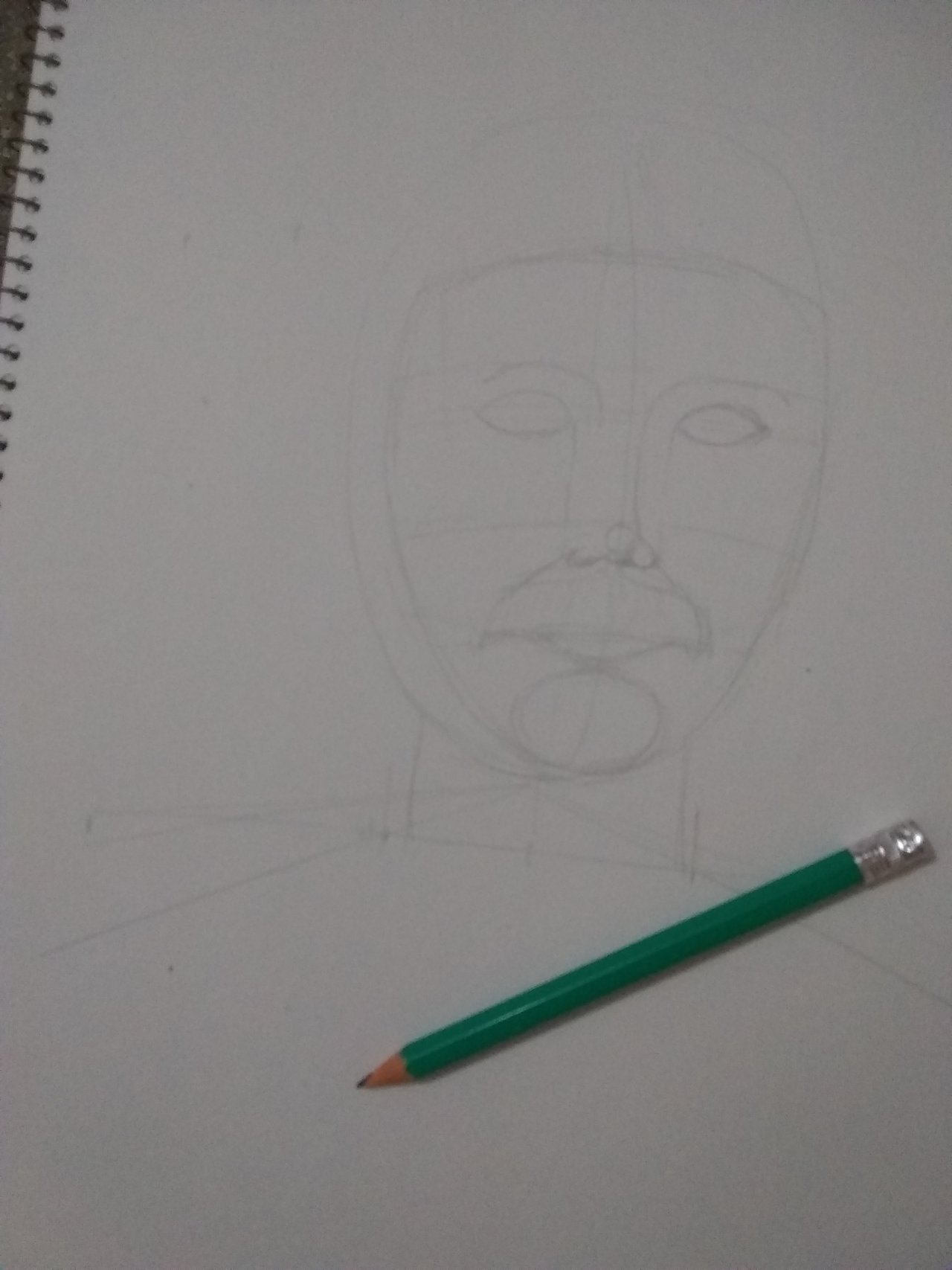 Ya ubicados los elementos, empezamos a darle detalles: definimos mejor ojos, nariz, bigote, labios, mentón, cuello.