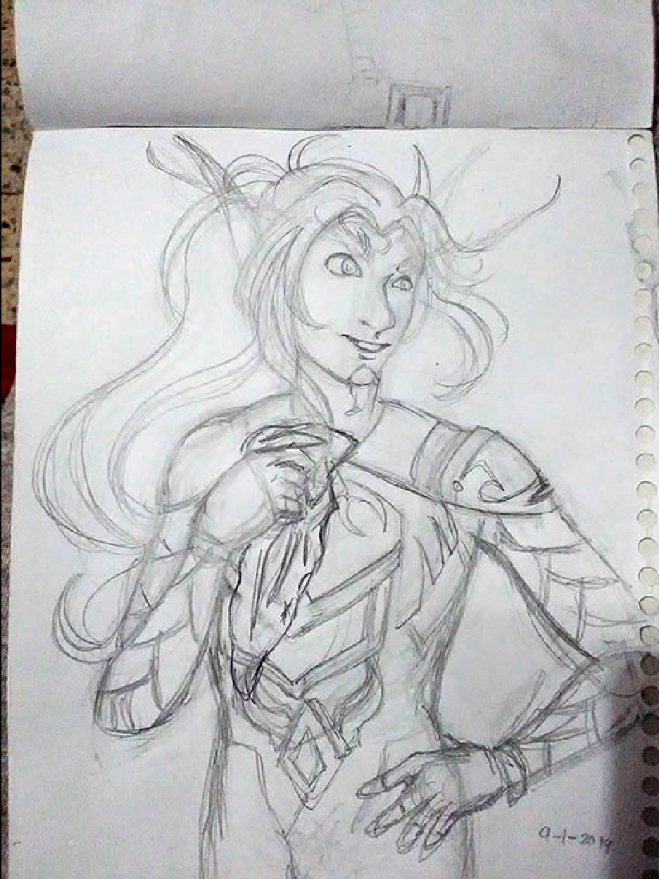I show here in order: Final piece, original sketch, digital sketch, flat colors, painting process, character reference screenshot.