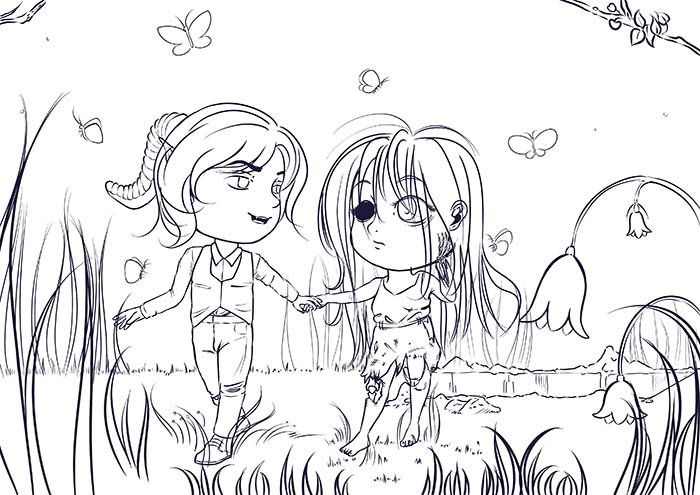 These characters are original characters of mine; I drew them in 2014 and the original sketch is actually from that date. Male character is a demon boy named Kaius and girl is an undead. I reedited my 2014 sketch to fit it better with my nowadays style. It was an interesting piece.