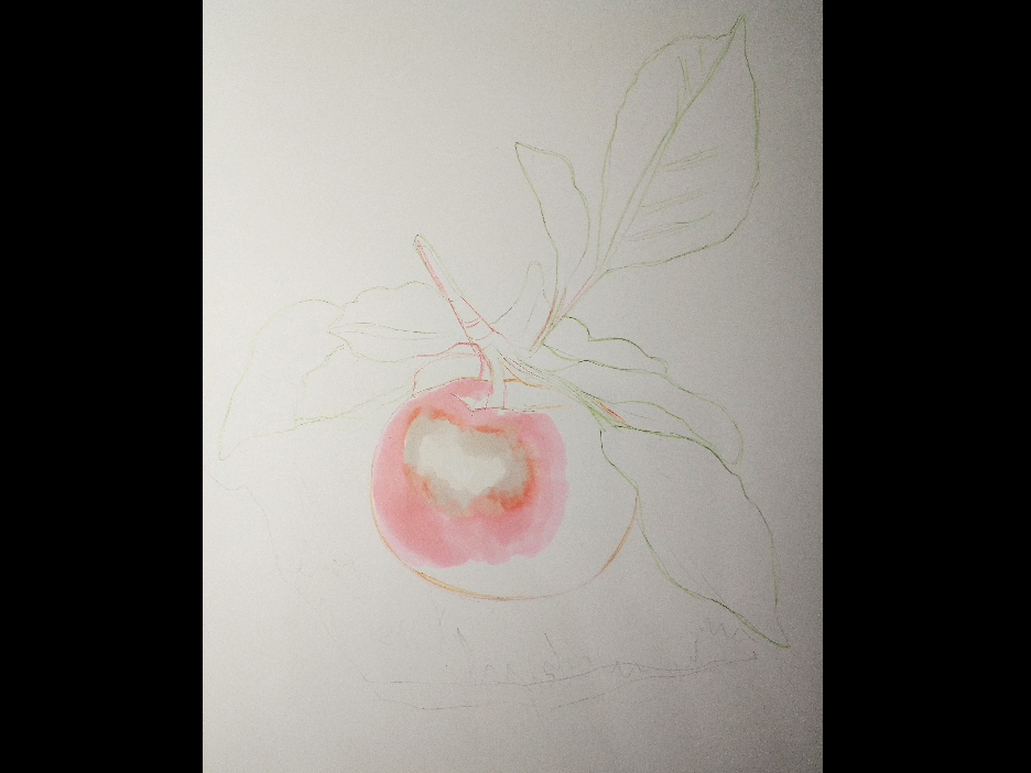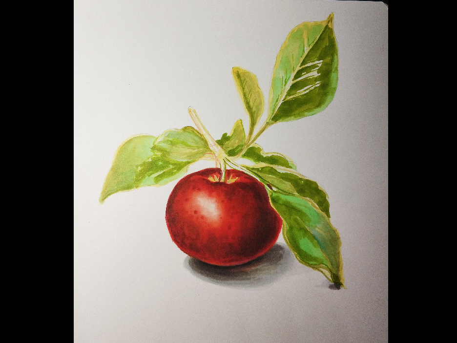 7.On the apple I emphasized the volume by enhancing the shadows, drew a reflex at the base of the fetus. Added a gray shadow on the plane. - At the final stage I drew a twig with brown and gray shades, strengthened the shadows on the leaves and the apple. With white pen painted reflexes and highlights.