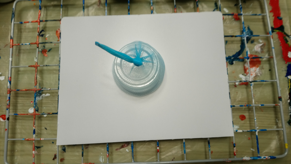 Today I tried to do something different. I wanted to pour on top of a container wrapped in a net so the paint would gradually flow down through the mesh. I saw people do this via a colander on YouTube and the effect was so beautiful. My board was much smaller so I thought I'd experiment with what I had at home to see if it would work. I wrapped the net around the container and secured the inside with sticky tape. The net was quite long so I tied a knot on top as well. The colours I used today were SAP green, opaque blue, silver grey left over from a previous pour so I add white to it, and white on its own.