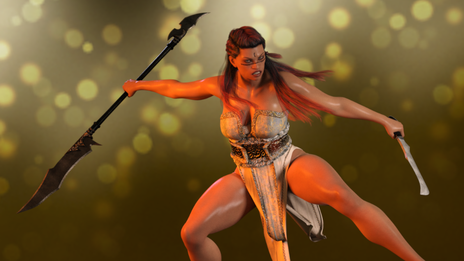 The warrior woman is my new model, Rhea for Genesis 8 Female. I made this shape and skin textures over Genesis 8 Female for Daz Studio. The model is on sale at https://www.renderosity.com/mod/bcs/rhea-for-genesis-8-female/136019/