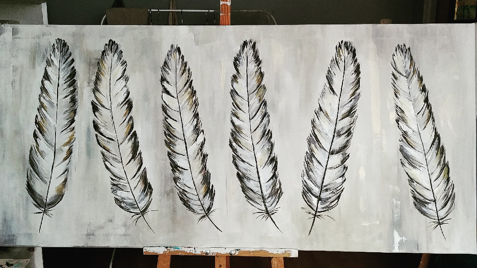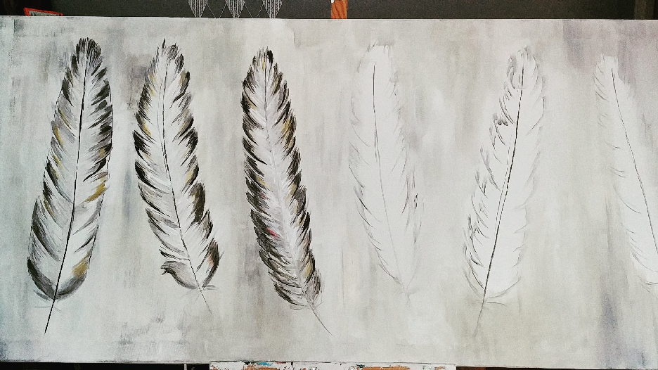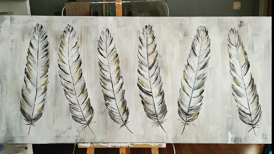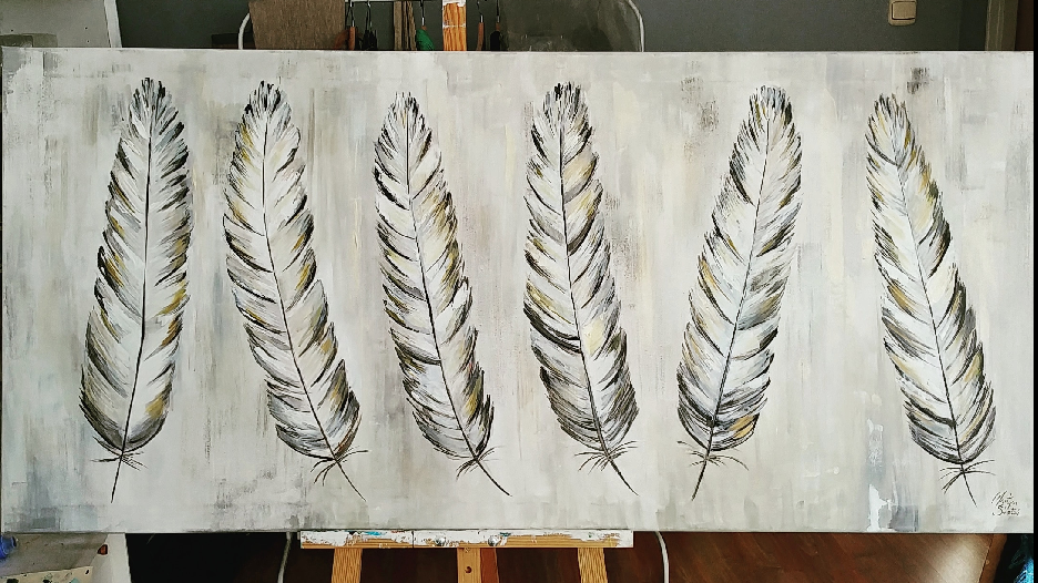 I would like to present you the results of my last work. I was painting feathers on canvas again. The canvas size was 140 cm x 70 cm. You can see the creation process step by step.