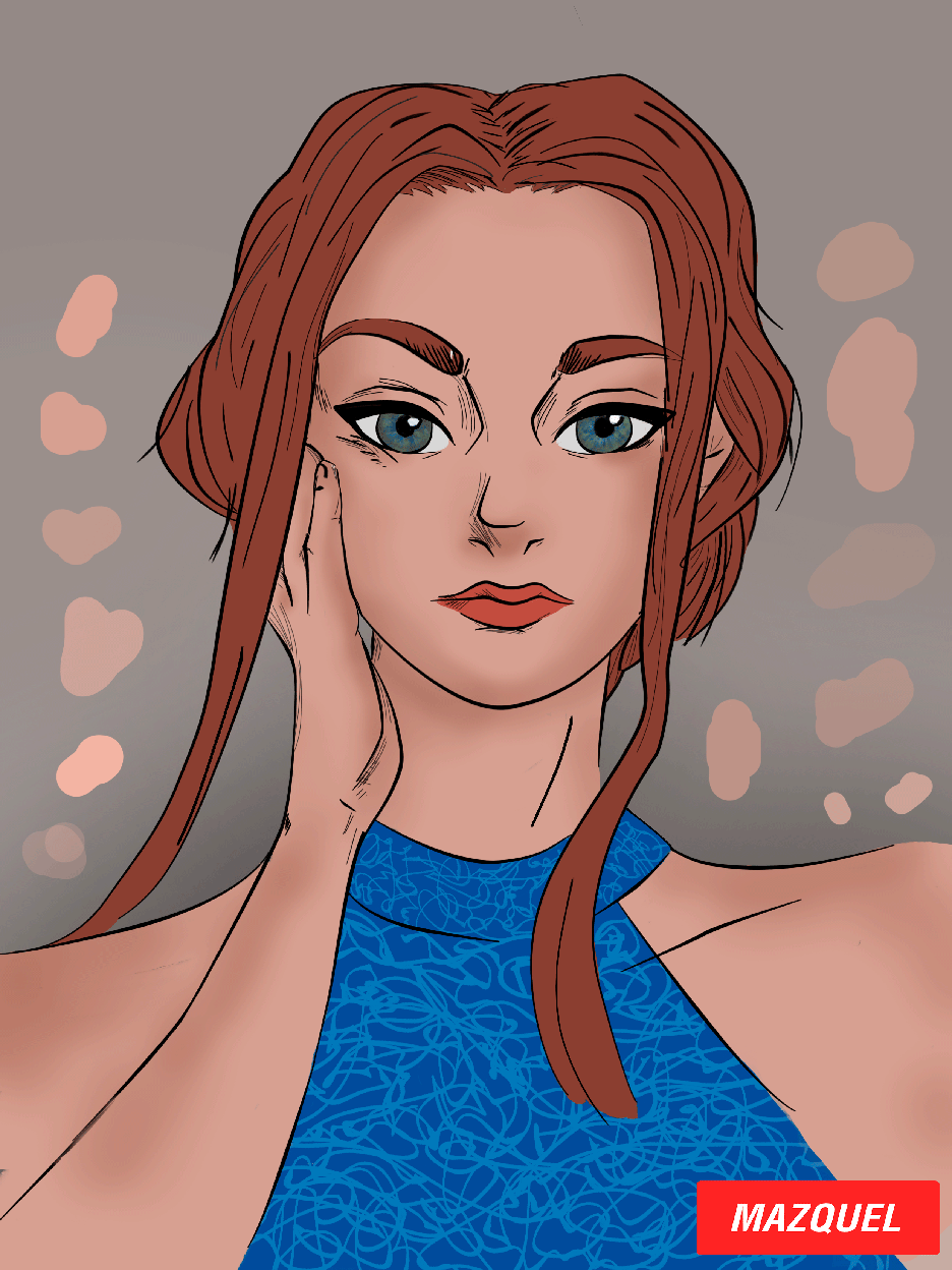 El proceso. Boceté en papel la chica y tomando una fotografía con el teléfono, en Photoshop empecé nuevamente a delinearla y jugar con líneas desordenadas de su cabello; después de colorearla empecé a agregarle las diferentes tonalidades y sombras, alrededor del dibujo, las manchas que ven son los tonos que he ido utilizando a lo largo del dibujo, esa es mi paleta de colores.