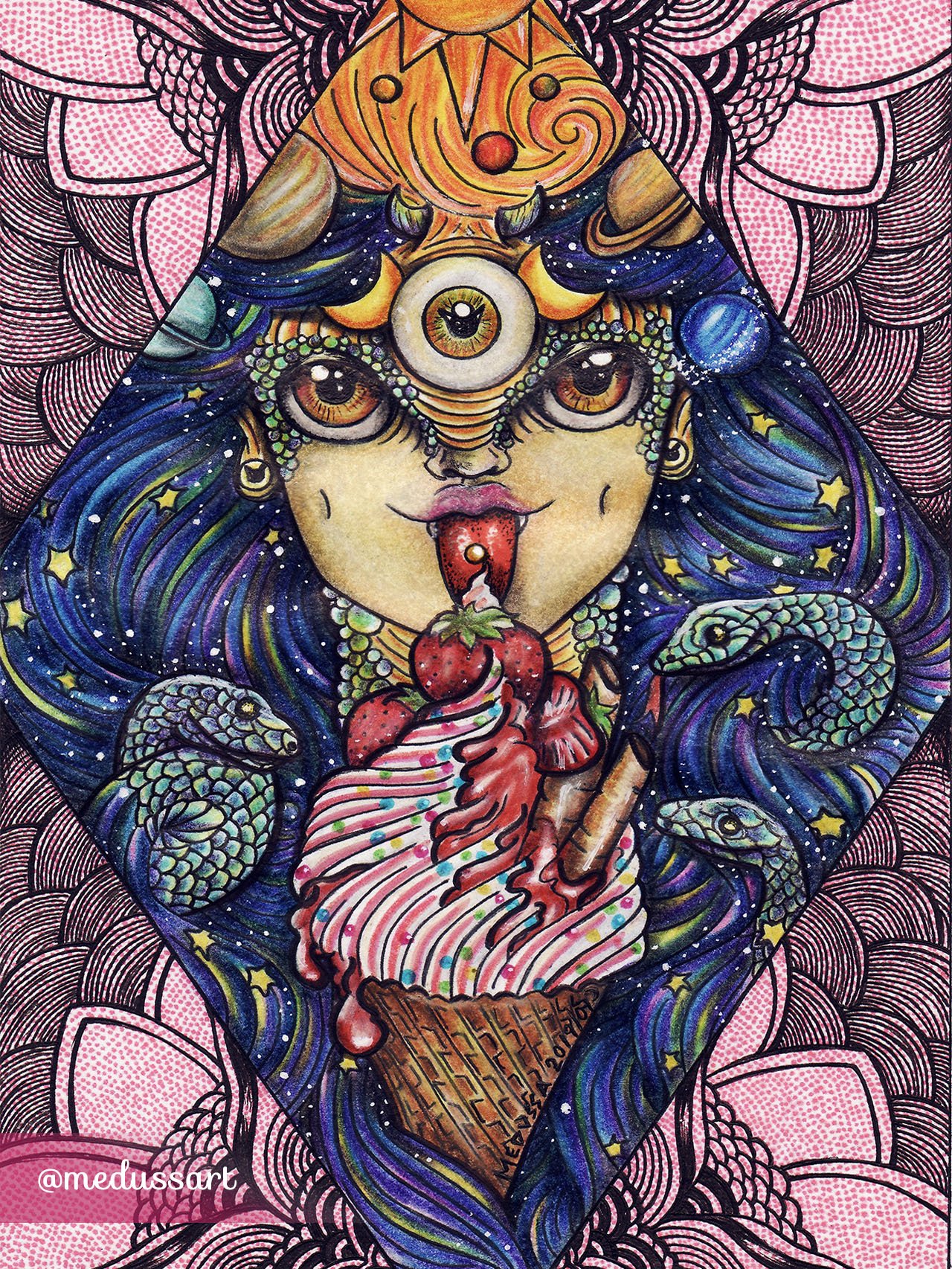 I wanted to create a galactic character, a beautiful and funny alien with that reptilian mix that I love. I'm a fan of galaxies and planets and everything related to it. As my artistic name is "Medussa" I'm also wanted to add some funny snakes in her pretty space hair, eating a delicious strawberry ice cream, mmmm!