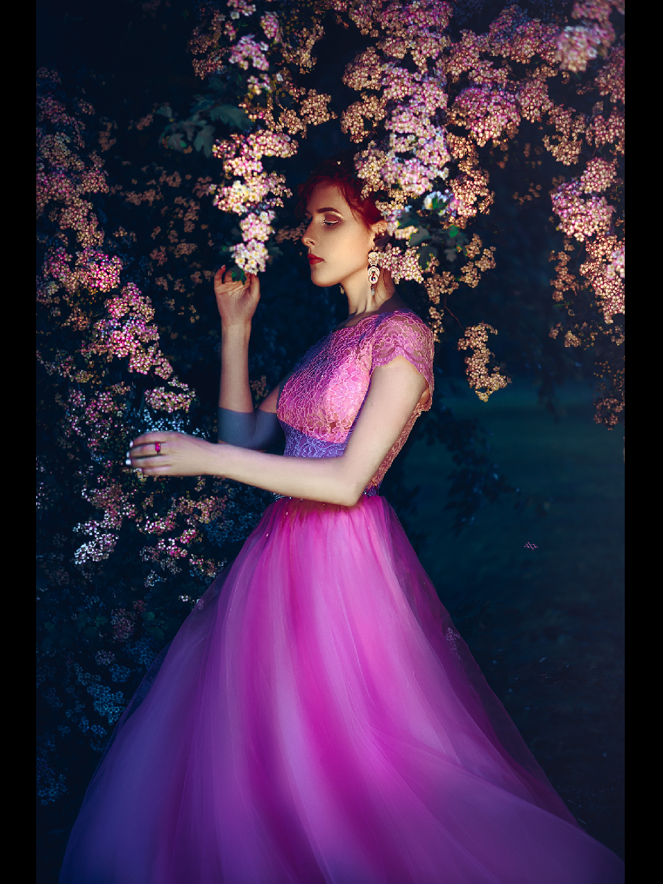 Emotional portrait shot at the spring public park at Klaipeda, Lithuania. Amazing blooming tree combined with right outfit and creative make-up. Left only to add some right emotion to the context..
