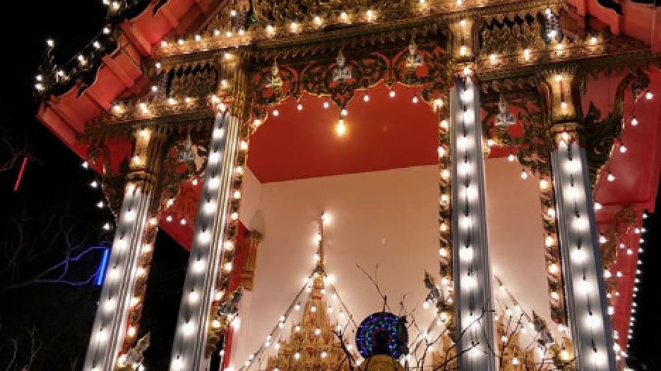 Brightness of colorful light inside the temple at night I took this picture when I traveled to the temple ceremony. It is a light from a lamp that is decorated at various points.