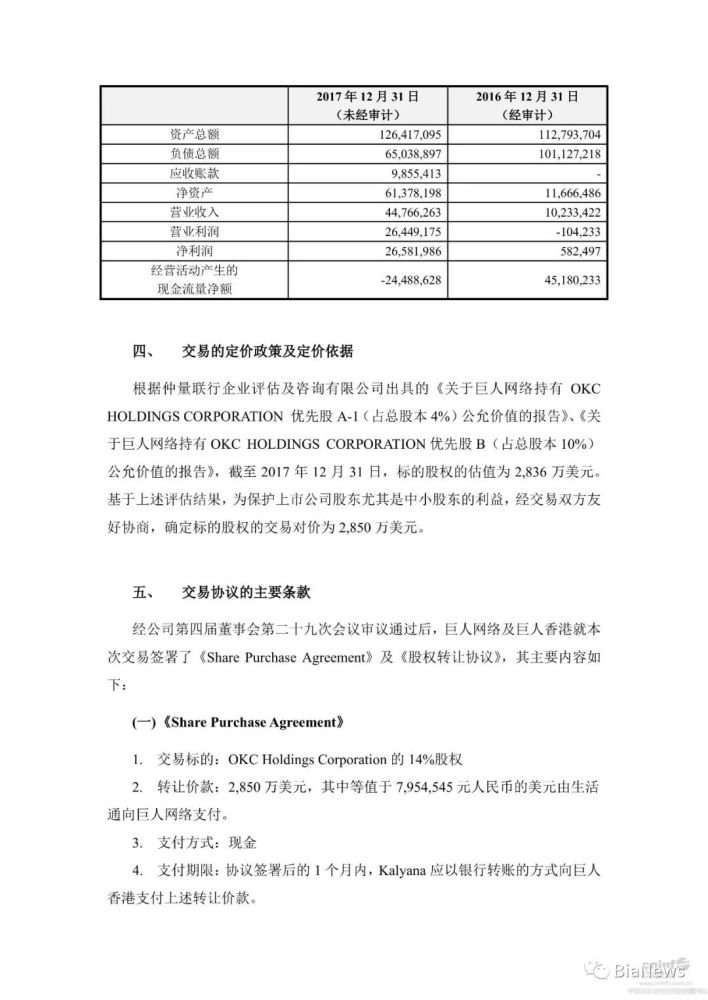 巨人网络称,于2017年4月完成对OKC Holdings Corporation(以下简称“OKC”)2,720万美元的投资。