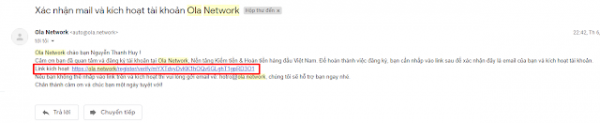 Sau khi bấm Đăng Ký bạn chờ mail gửi vào hòm thư để kích hoạt tài khoản Ola