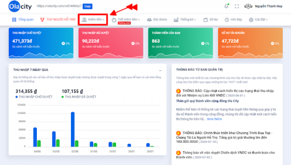 Bước 3: Kiếm tiền nào Đăng nhập vào tài khoản chọn vào KIẾM TIỀN như ảnh dưới