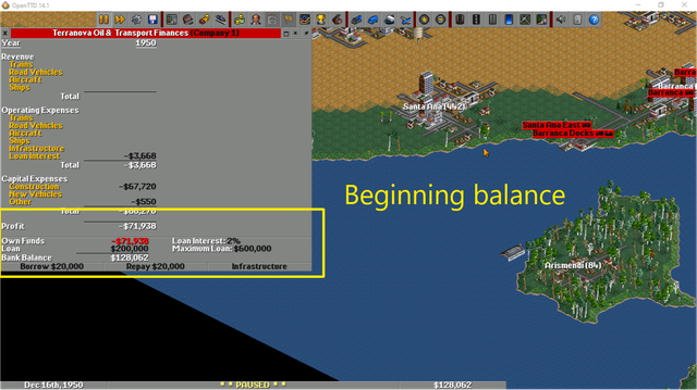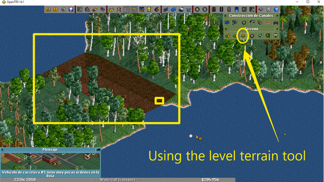3.1. Demostrar uso la herramienta nivelar el terreno Aprovecho esta tarea para demostrar la nivelación del terreno para abrir un canal de paso. Identifiqué un istmo entre dos masas de agua. De ambos lados existen ciudades con potencial de crecimiento. Entonces, vi que tenía saldo. A favor, consulté el costo de nivelar el terreno y salía como en 100.000. Ya no debí a préstamos, por lo que solicité uno de 100. Para pagar dicho trabajo. Las imágenes muestran las etapas. |