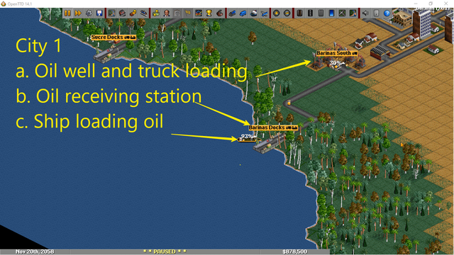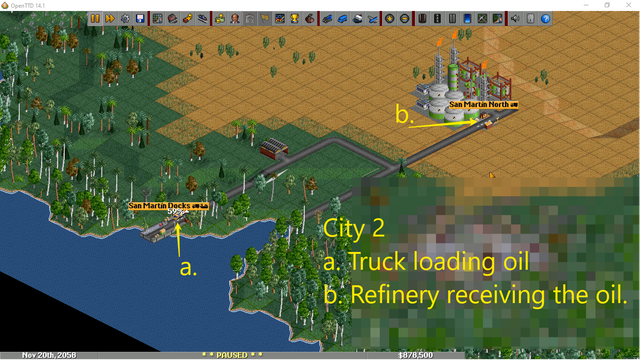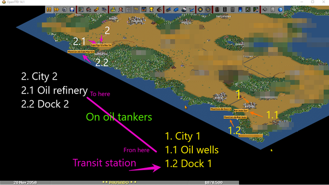 2.2 DemostrarciónUbiqué 2 ciudades, ambas en la costa o cerca de ella, una con pozos petroleros (ciudad 1) y la otra con una refinería (ciudad 2). El plan consistió en llevar petróleo desde la ciudad 1 hasta la ciudad 2, en un barco petrolero.