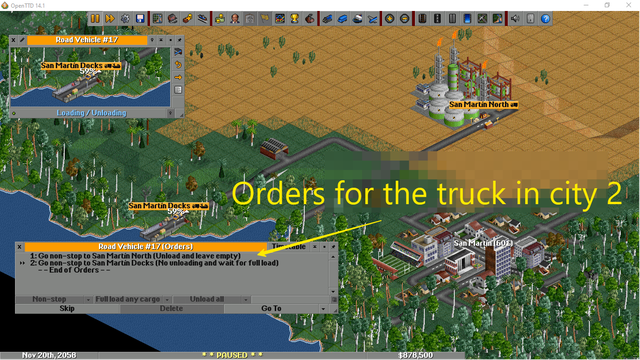 La estación de tránsito se colocó el muelle (dock 1), esta recibía el petróleo en camiones que llegaban desde los pozos. El barco llegaba al muelle 1 y cargaba el petróleo, descargándolo luego en muelle 2. Allí venían camiones que lo recibían para trasladarlo a la refinería y entregárselos. La dificultad encontrada estuvo en la programación de las órdenes, al traducirlas al español, surge cierta confusión semántica. Mi solución fue probar ensayo y error, comprar un transporte probarlo hasta que viera los numeritos verdes que aparecen flotando o las cifras de porcentaje que señalaban las cargas y descargas. |
