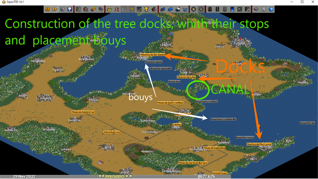 La segunda imagen muestra una toma amplia, de los lugares donde coloqué muelles, las boyas y los barcos ya recorriendo la ruta. No coloqué imágenes de la compra de barcos aquí, pues ya lo demostré en la tarea 1.