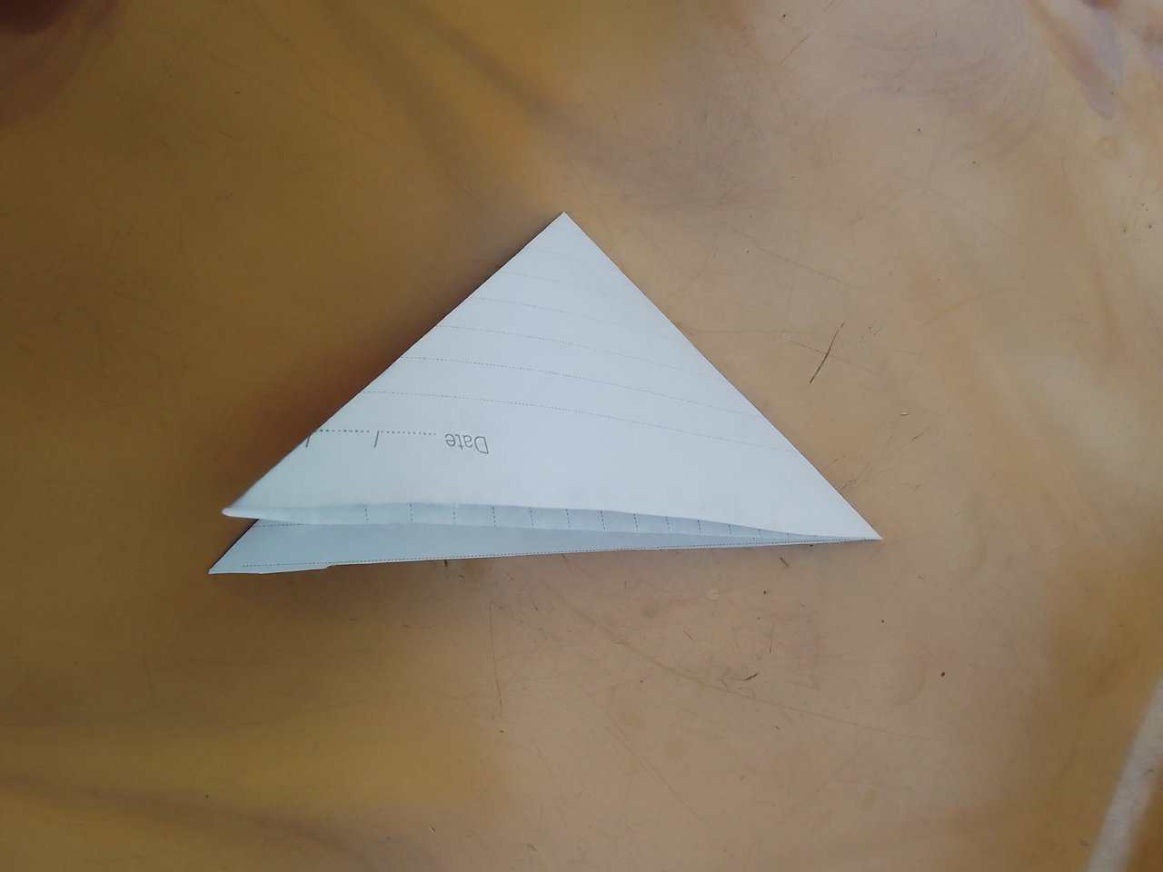 এরপর কাগজটির মাঝখান দিয়ে একটি ভাঁজ অন্যপাশে এবং অপরপাশে আবারো মাঝখান দিয়ে একটি ভাঁজ দিয়ে তিনকোনা আকৃতির করে নিলাম। ভাঁজ দেওয়া হয়ে গেলে কাগজটি দেখতে ঠিক এমনটা দেখাবে।
