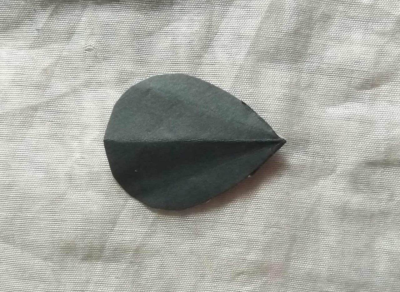 এবার কালো রং এর কাগজ কেটে নিয়েছি পাতার শেপে লেডী বাগের মাথা বানানোর জন্য। এরপর পাতার মতো কেটে নেয়া অংশটি বানানো লেডি বাগের শরীরের সাথে গাম দিয়ে লাগিয়ে দিয়েছি। আর এভাবেই তৈরি করে নিলাম লেডী বাগ এর অরিগ্যামিটি।