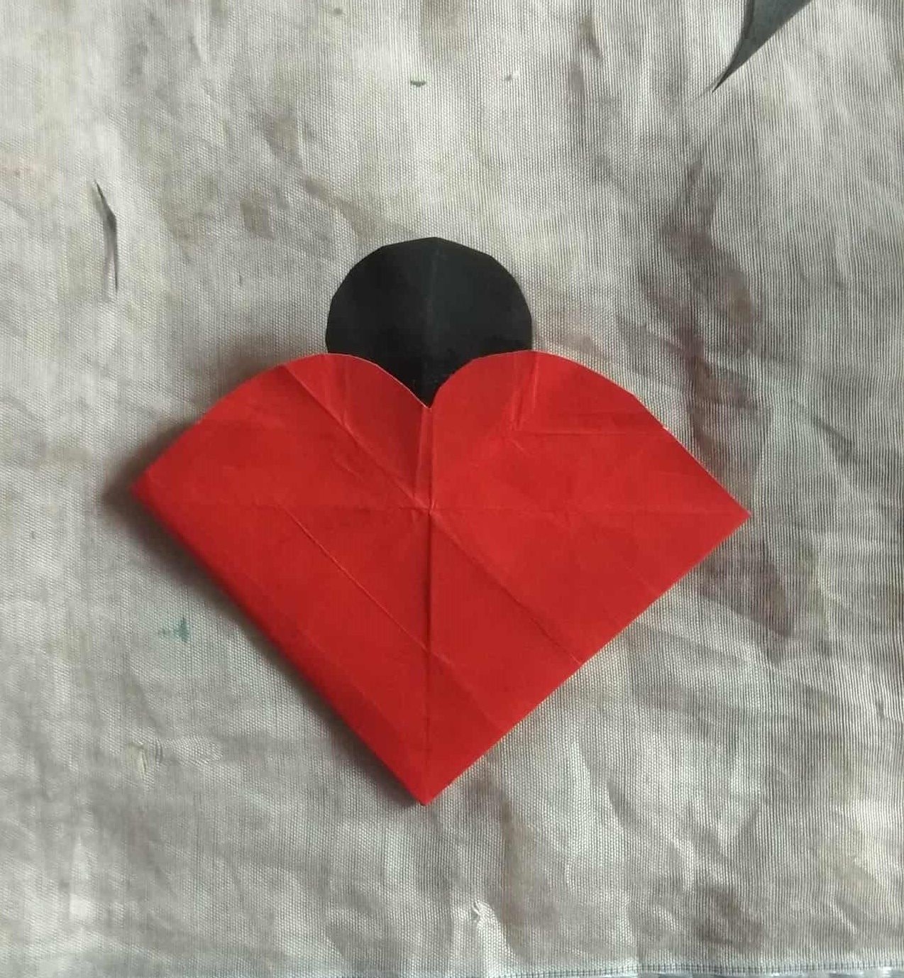 কাগজের অতিরিক্ত অংশ গোল করে কেটে নিয়েছি। যা দেখতে হার্ট এর শেপের মতো হয়েছে। আর এটি হলো লেডীবাগের শরীর।