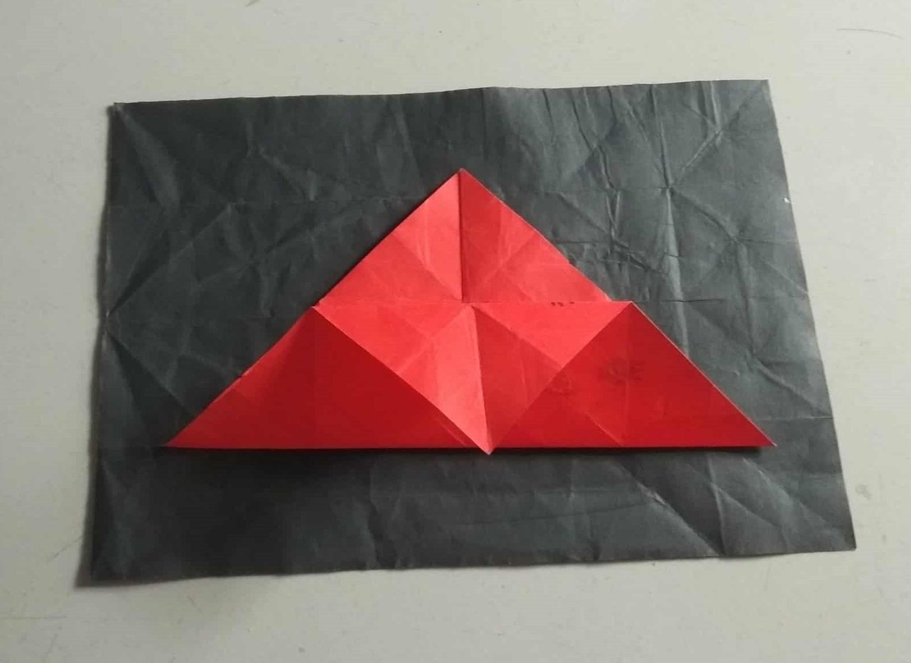 উপরের দিকে কোনা অংশটি নিচের দিকের ভাঁজ বরাবর ভাঁজ করে নিয়েছি। দাগের অংশটি কাগজের ভাঁজে ঢুকিয়ে দিয়েছি।