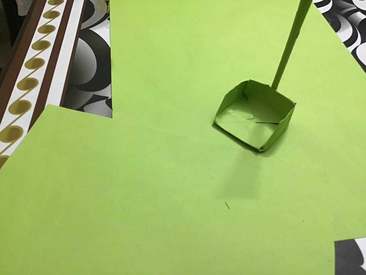 এবার আমি এক পাশ ভাঁজ করে নিলাম।এবার আর এক টুকরো কাগজ নিয়ে পেঁচিয়ে লম্বা ষ্টিক তৈরি করে নিলাম।এরপর গ্লু দিয়ে ডাস্ট প্যান লাগিয়ে নিলাম।এভাবেই আমার কাগজের তৈরি ডাস্ট প্যানটি তৈরি করা হয়ে গেলো।