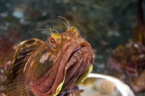 Sarcastic fringe head or Neoclinus blanchardi: a fierce fish with a big mouth and aggressive territorial behavior. When two Sarcastic fringe heads meet they have a fight over the area, and fight with their snouts relaxed as if kissing. The one who opens will be the biggest and will be dominant.