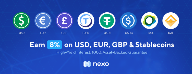 Estamos encantados de comenzar a pagar el 8% por año en USD (dólares estadounidenses) y GBP (libra esterlina), además de nuestras opciones existentes en Stablecoins y EUR, haciendo Nexo la única institución financiera autorizada y regulada en blockchain que ofrecer esto.