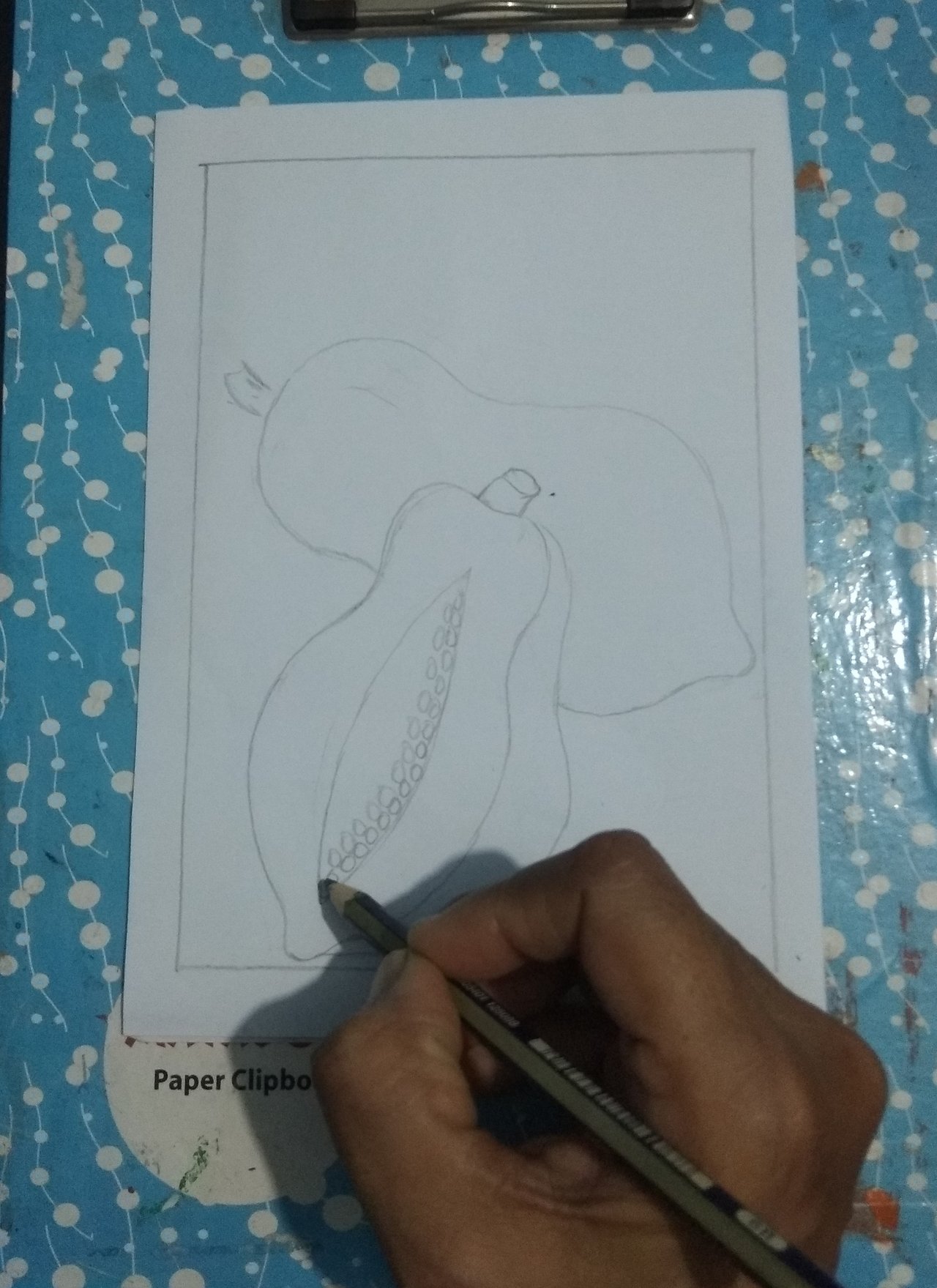 পেন্সিলের দাগের মাঝখানে একটি আস্ত পেঁপে ও একটি অর্ধেক পেঁপে এঁকে নিয়েছি।