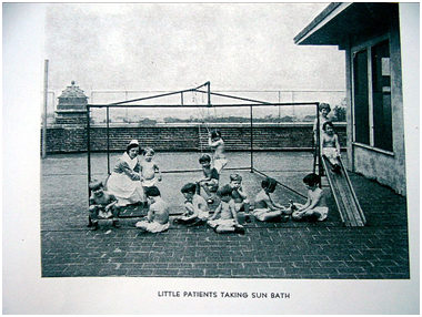 Sometimes, on the roof where children were treated (sun, fresh air seemed important at the time for the care of tuberculosis) a nursery rhyme sounds: "Ring around the Rosy" sung by children.