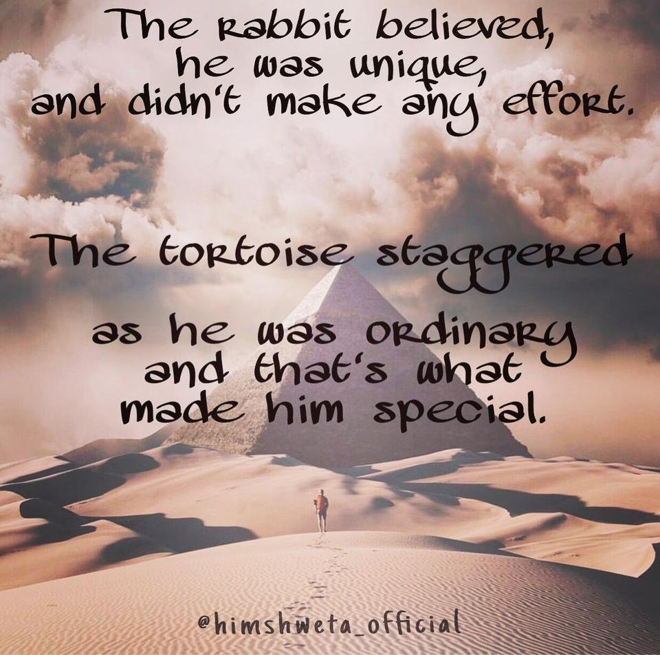 The tortoise too believed he was special. Why would he enter the race with a rabbit otherwise. But he made an effort. That is how he won. So the simple moral here is to understand that yes we are special, but we need to make others believe the same, and we can make others believe that we are special by proving it to them. Not by just being proud about the uniqueness you own.