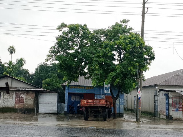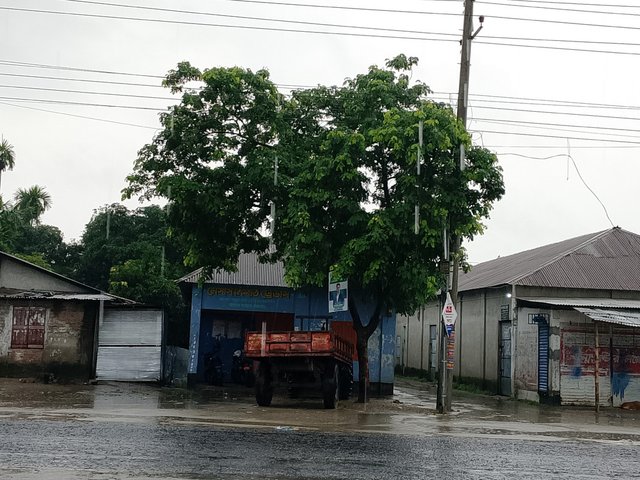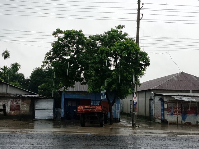 It was raining, and I stopped in the middle of the road. There were two more people with me. After eating, we saw that rain was falling on the road, and we stood on this side of the road. From this side to the other side, some shops could be seen, and that place was located far away. We had gone there today to see it, but because of the rain, we got stuck there. After that, we returned from there.
