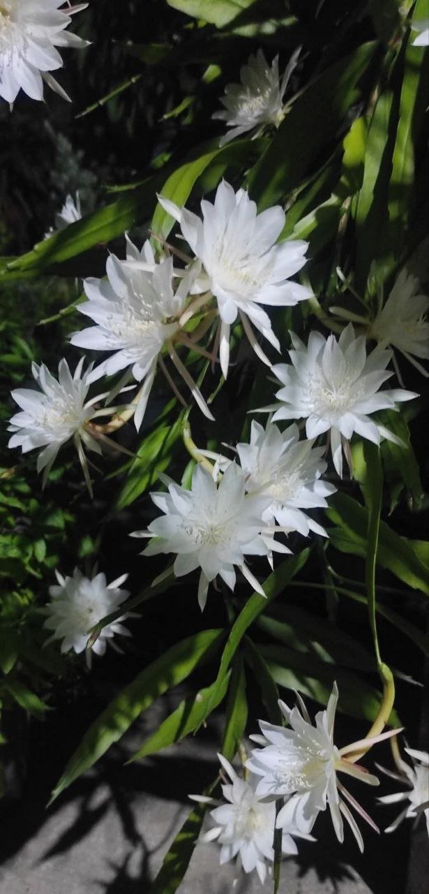 This flower is large, white, and has multiple layers of petals. It blooms at night and withers before dawn. The flower spreads a sweet and pleasant fragrance. Each flower can be about seven to eight inches long. It is a type of cactus plant, but its stem is flat and leaf-like, and the plant usually grows in a vine-like or hanging form.