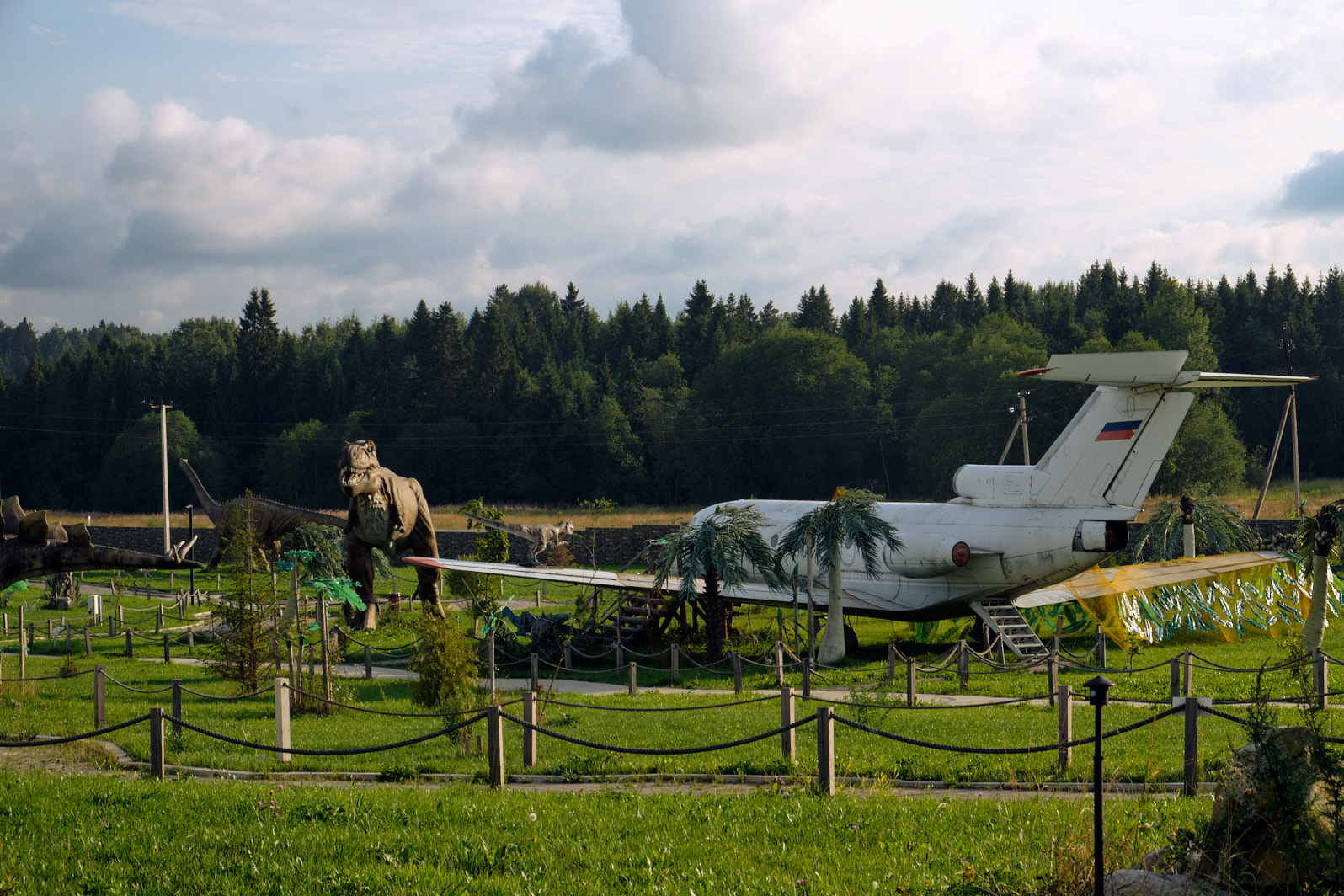 Пассажирский реактивный самолет в окружении динозавров? Серьезно? Именно такую картину можно увидеть в центре семейного отдыха Yes! рядом с Вологдой. В динопарке стоит списанный самолет Як-40.