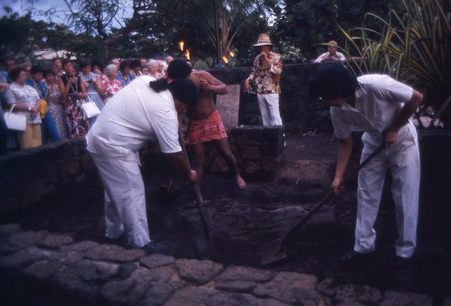 The last photo shows a pig being roasted in the traditional Hawaiian way. This was likely part of a luau probably put on by a hotel specifically for the tourists I would imagine.