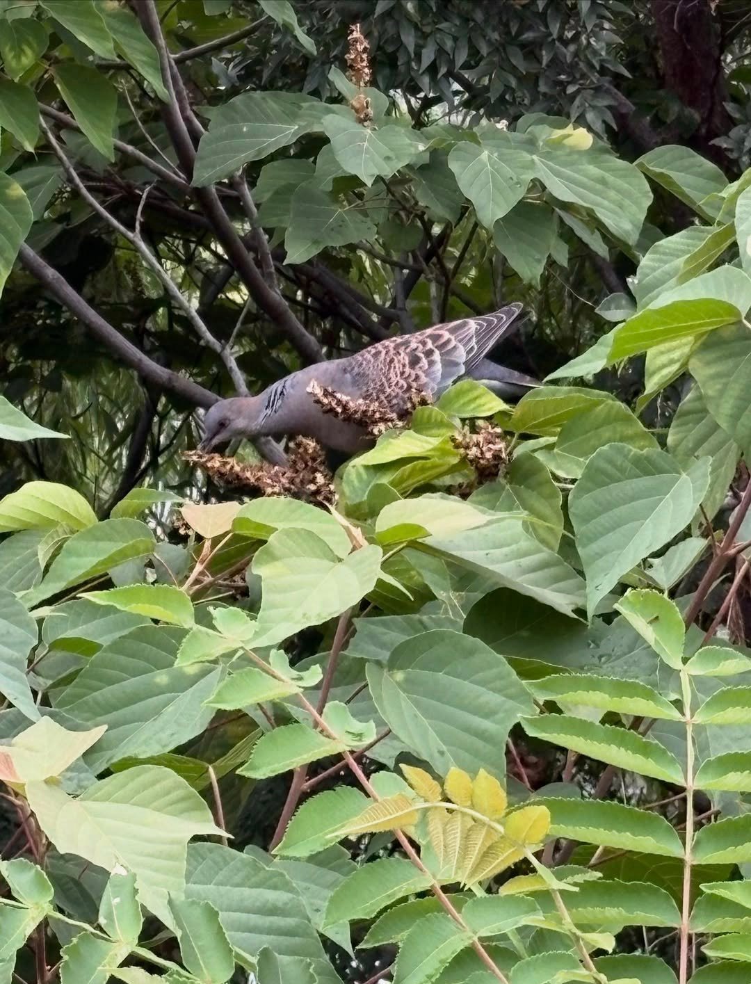 The head is slightly bluish-gray and the eyes are dark surrounded by a narrow ring of bare skin the bird typically measures around 30 to 32 centimeters in length and weighs between 150 to 200 grams the spotted dove is highly adaptable and is often seen in both urban and rural habitats including gardens parks farmland forest edges and open scrublands it feeds mainly on seeds grains and small plants but may also consume insects on occasion they forage mostly on the ground walking with a graceful gait and picking up food items with their slender beak these doves are known for their soft cooing calls which are repeated in a rhythmic manner and often heard in the early morning or late afternoon.