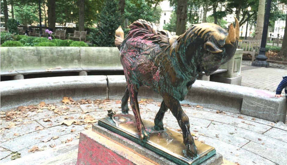 Took this picture just before Christmas as Philadelphia saw some pre-holiday snow, which is a bit of a rarity. The statue at front and center is Billy the Goat, which has been in the square since 1919. Here is another pic of him as the city discusses the potential to replace this staple as it's in a bit of rough shape.