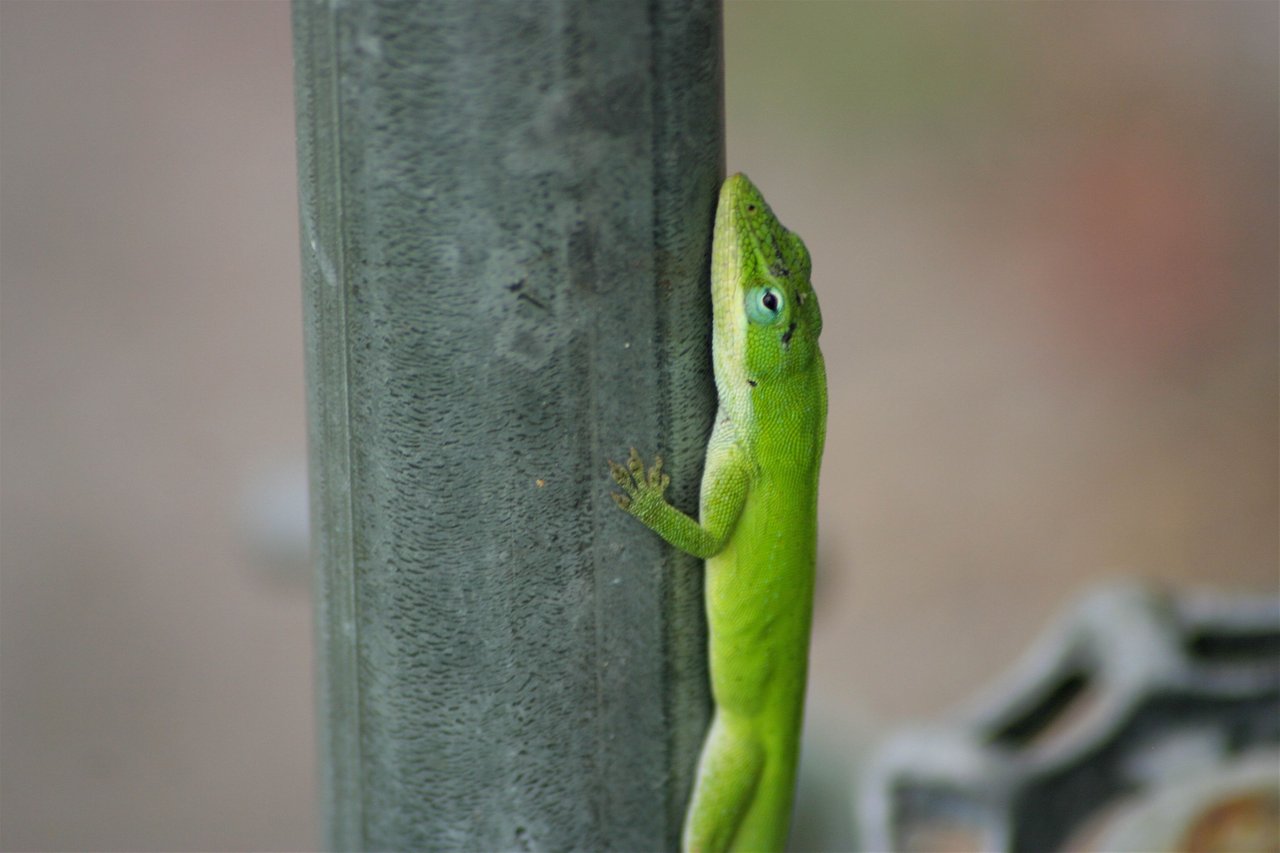 I was able to capture a bright green lizard (he would fit in rather nicely in the Emerald City) hanging out on an abandoned septic tank today using a Canon 80D camera with a 75 - 300 mm lens on the macro setting.