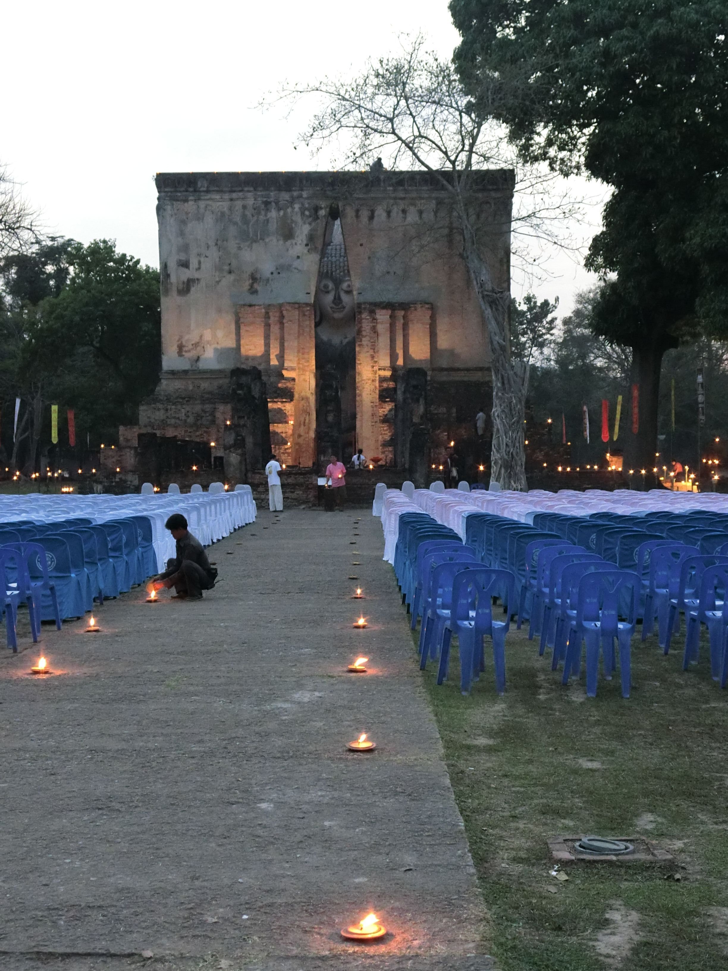 That day happened to be the most important festival in Sukhothai as once in 12 years on Dec. 15 of the lunar calendar, the moon would move right at the top of Budda Phra Achana at midnight, the villagers hold a ceremony with dogmas chanting and offerings to the Budda and to the human beings. They had prepared candles to light up the way and the rim of the temple. Under the feet of Phra Achana they placed a large water bowl so that when the moon went up to the top of Phra Achana, the moon will reflect into the water, so the moon and Phra Achana and the water moon would be aligned.