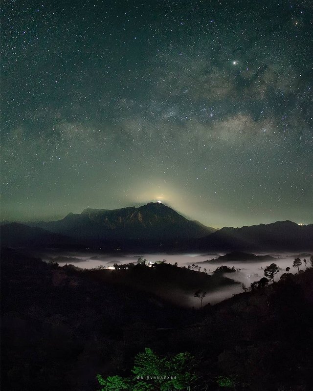 A true wonder of nature from the land below the wind. I stayed up for the whole night at this spot. Witness up to five shooting stars. There's more photos with slightly different composition and this is one of my favorite. I didn't expect the moon to rise from the peak of Mount Kinabalu itself. I was lucky my camera is already in time-lapse mode. So i just sat there soaking in all the wonder while my camera do the job. There's more photo where the edges of the crescent moon itself barely rise, producing a three diamonds glow between the Mount Kinabalu peak, just like the diamond we see during solar or lunar eclipse. The moon in this photo looks round shape because the camera is doing a long exposure shot. Instead, it was the darker part of the moon that was shown in this picture. The brightest part of the moon hasn't risen yet.