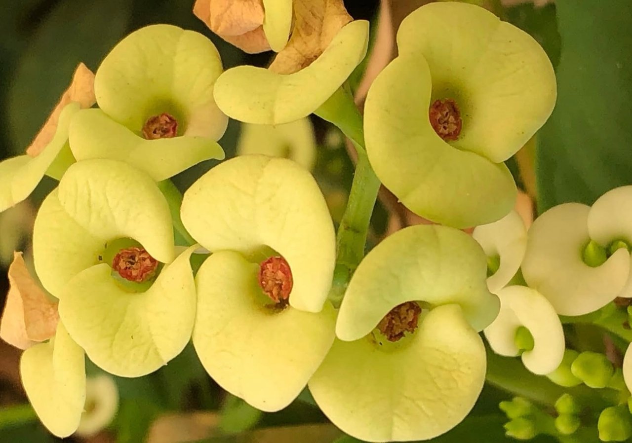 With its bright blossoms blooming against a backdrop of thorny stems, it stands as a living reminder that beauty and resilience can exist side by side.At first glance, the Crown-of-Thorns is striking. Its thick, spiny stems seem unwelcoming, yet from them emerge delicate clusters of tiny flowers most often red, pink, or yellow surrounded by colorful bracts that resemble petals. This sharp contrast between fragility and toughness makes it not just a garden plant, but a symbol of life’s paradoxes.