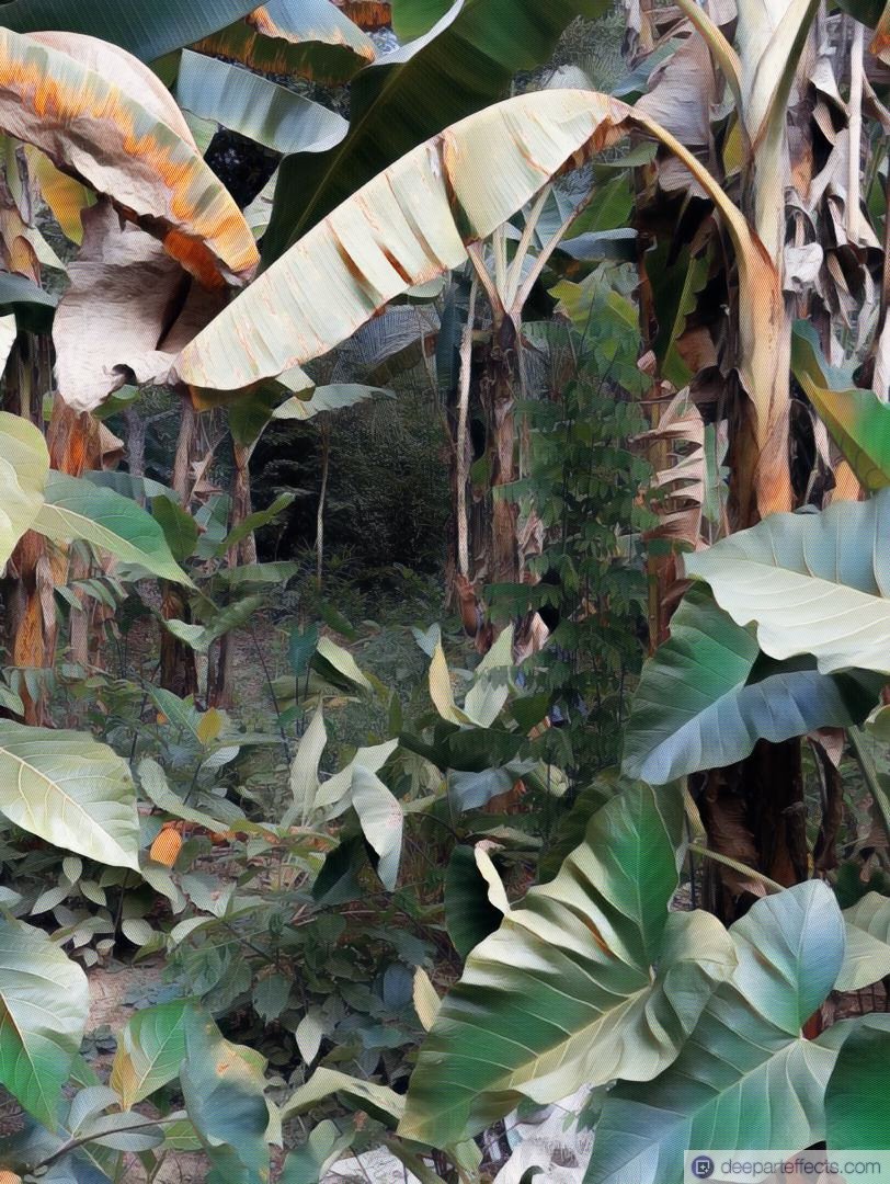A slow, creeping dread begins to take hold. You realize you aren't just in the jungle; you're trapped by it. The massive, fibrous trunks of the banana plants seem to lean in, their decay a palpable smell. You frantically search for a path, but every opening leads only deeper into the tangled, suffocating vegetation. The bright green growth is beautiful yet menacing, a living, breathing labyrinth that refuses to let you go.