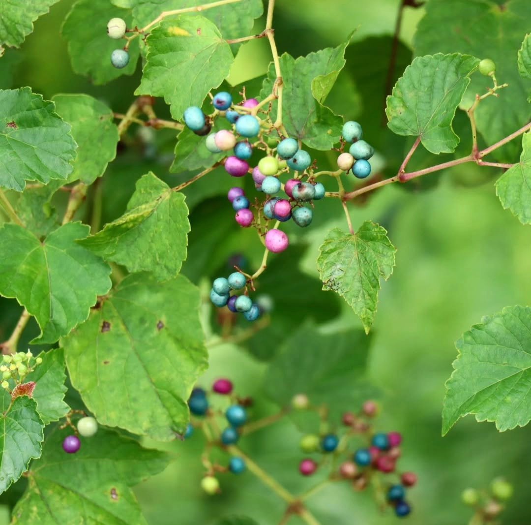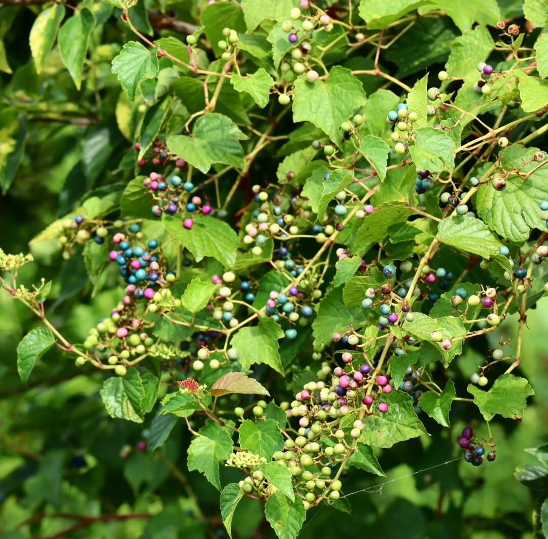 Amur peppervine is a fast growing deciduous woody vine in the native to Northeast Asia including China Japan Korea and the Russian Far East it is well known for its vigorous climbing habit its attractive lobed leaves and especially its unique berries that display a stunning range of colors from pale green to turquoise pink purple and deep blue often all on the same cluster giving it strong ornamental appeal the vine can climb by tendrils and easily attach itself to fences trellises walls or nearby vegetation often reaching lengths of 15 to 30 feet or more under favorable conditions the leaves are typically alternate and may be heart shaped or deeply lobed depending on the plant’s maturity and growing environment during summer small greenish white flowers appear in clusters though these are not particularly showy.