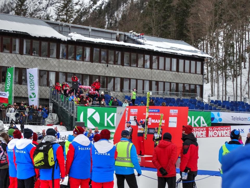 - Trybuna A, zdaje się, 55 euro sztuka – niby bliżej zeskoku i miejsca lądowania, ale... przede wszystkim, duże ryzyko, że sąsiedzi machający flagami będą machać akurat wtedy, kiedy będziesz chcieć coś zobaczyć. Do tego – skoczkowie opuszczają zeskok po przeciwnej stronie, więc na autografy nie ma co liczyć. Plus taki, że można porobić fajne zdjęcia.