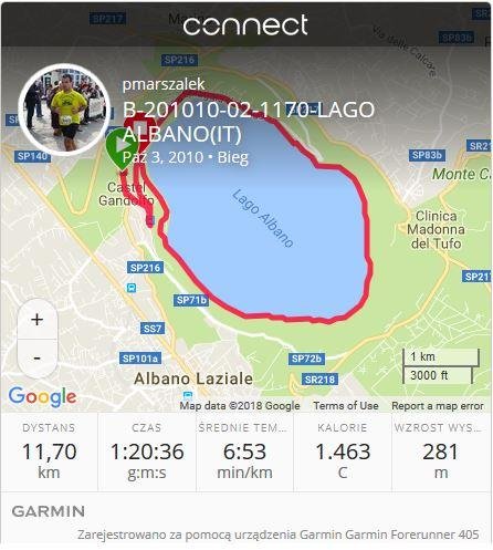 Wrzesień upłynął na dalszych regularnych treningach w ciągu tygodnia, wraz ze wzrostem wytrzymałości zwiększałem również dystans, pod koniec września byłem już w stanie przebiec 8 km w tempie 6:04 min/km, waga nadal spadała. Nie przerywałem treningowej rutyny nawet gdy wyjeżdżałem służbowo, pobyt we Włoszech zacząłem od obiegnięcia jeziora Albano nieopodal Castel Gandolfo.
