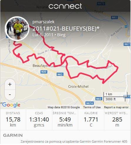 Miesiąc przed zaplanowanym półmaratonem zdecydowałem się na udział w swoich pierwszych zawodach, na debiut wybrałem 10 milowy bieg przełajowy w Beaufays (Belgia), nie do końca byłem świadomy ukształtowania terenu na trasie, więc najcięższy podbieg przeszedłem, ale suma summarum byłem zadowolony z występu.